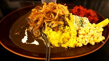 ③福神漬け ⑧コーンマヨ ⑩フライドオニオンを選択して出てきたカレーがこれ!!
